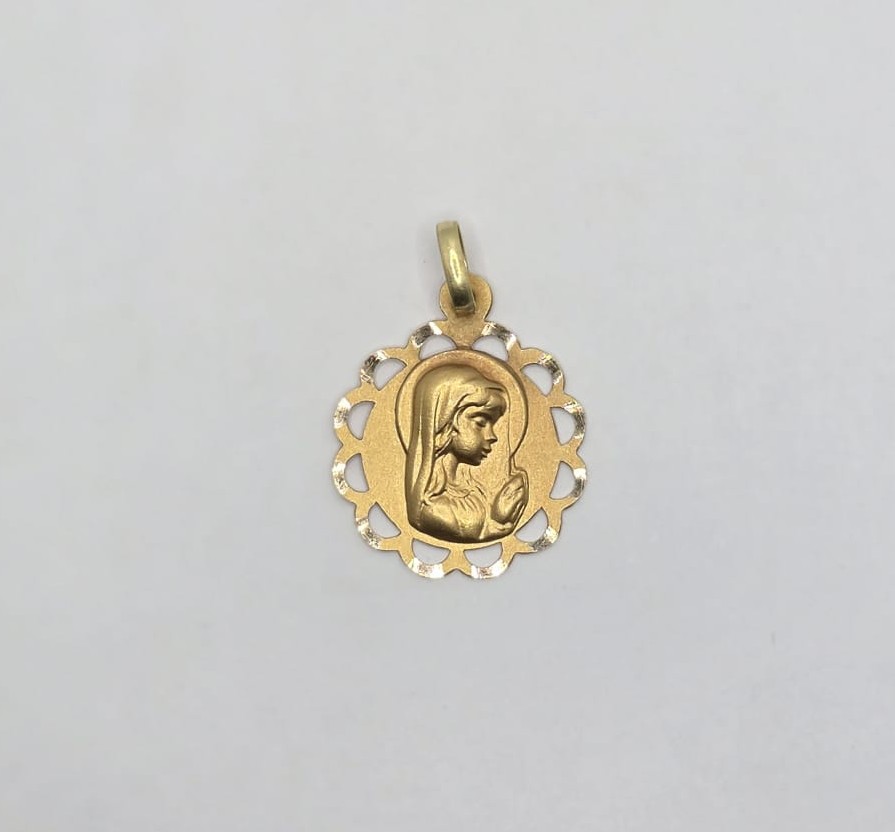 Medalla de oro en forma de flor 18k de 18mm de diámetro con el relieve de la imagen de Virgen niña Manto. Esta preciosa medalla tiene un acabado mate con un tallado clásico que hace destacar el relieve de la figura . Además puede ser gravada en su espalda lisa con dedicatoria. Ideal como regalo.