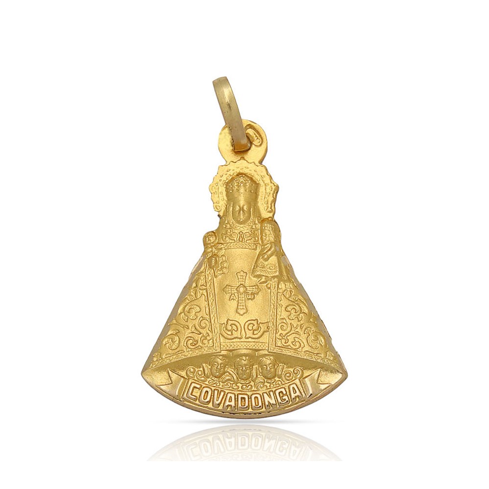 Medalla de Oro de Ntra. Sra. de Covadonga en Silueta de 25mm de alto hecha en oro de 18K con el relieve de la imagen de la Ntra. Sra. de Covadonga. Esta preciosa medalla tiene una acabado mate con el borde con un tallado salpicado que hace destacar el relieve de la figura. Además puede ser gravada en su espalda lisa con dedicatoria. Ideal como regalo.
