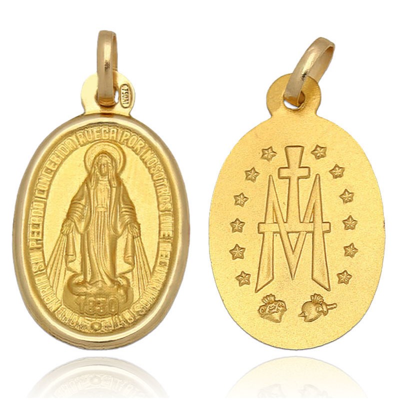 Medalla Ovalada de oro de 18k de forma oval 25x18mm con el relieve de la imagen de Virgen Milagrosa por la cara delantera . Esta preciosa medalla tiene un acabado mate con bisel en brillo que hace destacar el relieve de la figura de la Virgen Milagrosa. Tiene una inscripción en el borde de la cara de la medalla que dice: “María sin pecado concebida, ruega por nosotros, que acudimos a ti”. Mientras que en la cara trasera aparecen 12 estrellas y la M sobre la que descansa una cruz sobre una barra. Debajo aparecen los corazones de Jesús y de María, de los cuales el primero esta con una corona de espinas y el segundo traspasado por una espada. Ideal como regalo.
