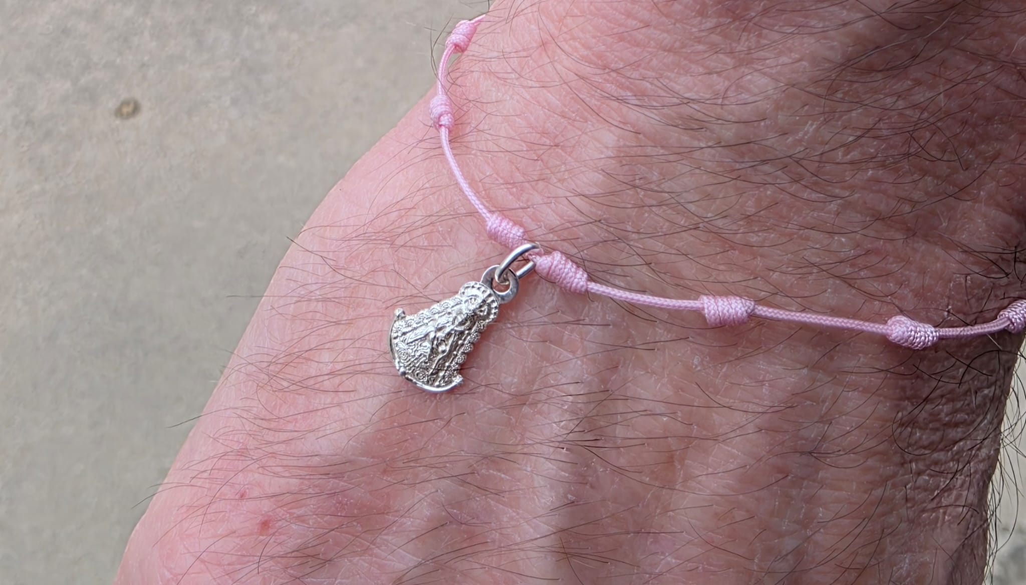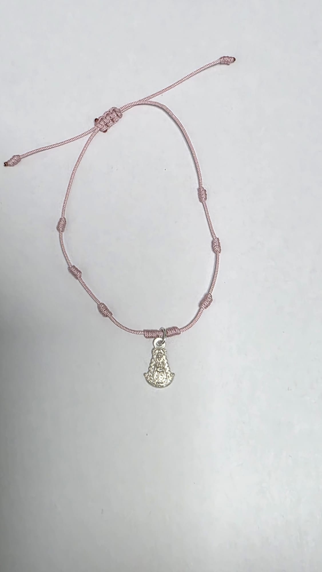 Sé el primero en valorar “Pulsera de nudos color Rosa claro con medallita de la Virgen del Rocío de Plata”