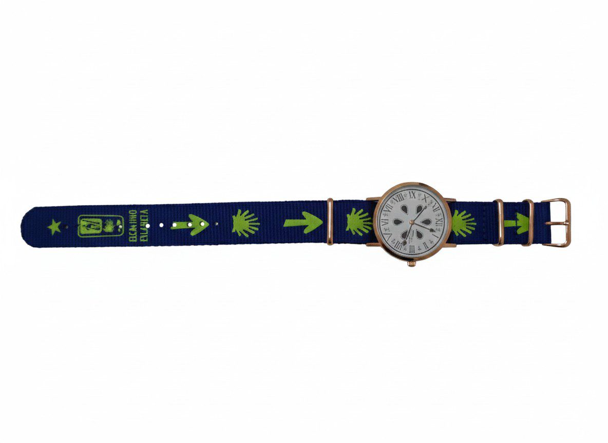 Reloj del Camino de Santiago con Caja de color Oro Rosa de 32mm de diámetro y correa NATO con la Concha del peregrino en Nailon.